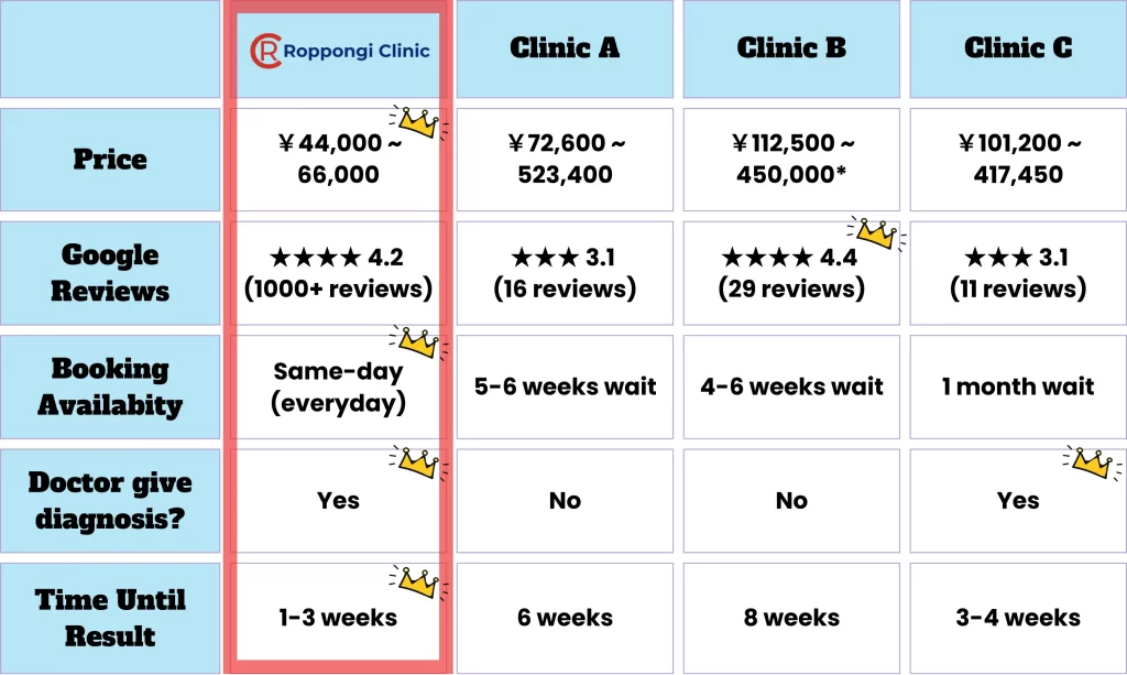Patients should expect to pay for the test (¥44,000~¥66,000) and for a doctor consultation (around ¥5,500 for new patients and around ¥1,500 for follow up patients) to get the diagnosis.